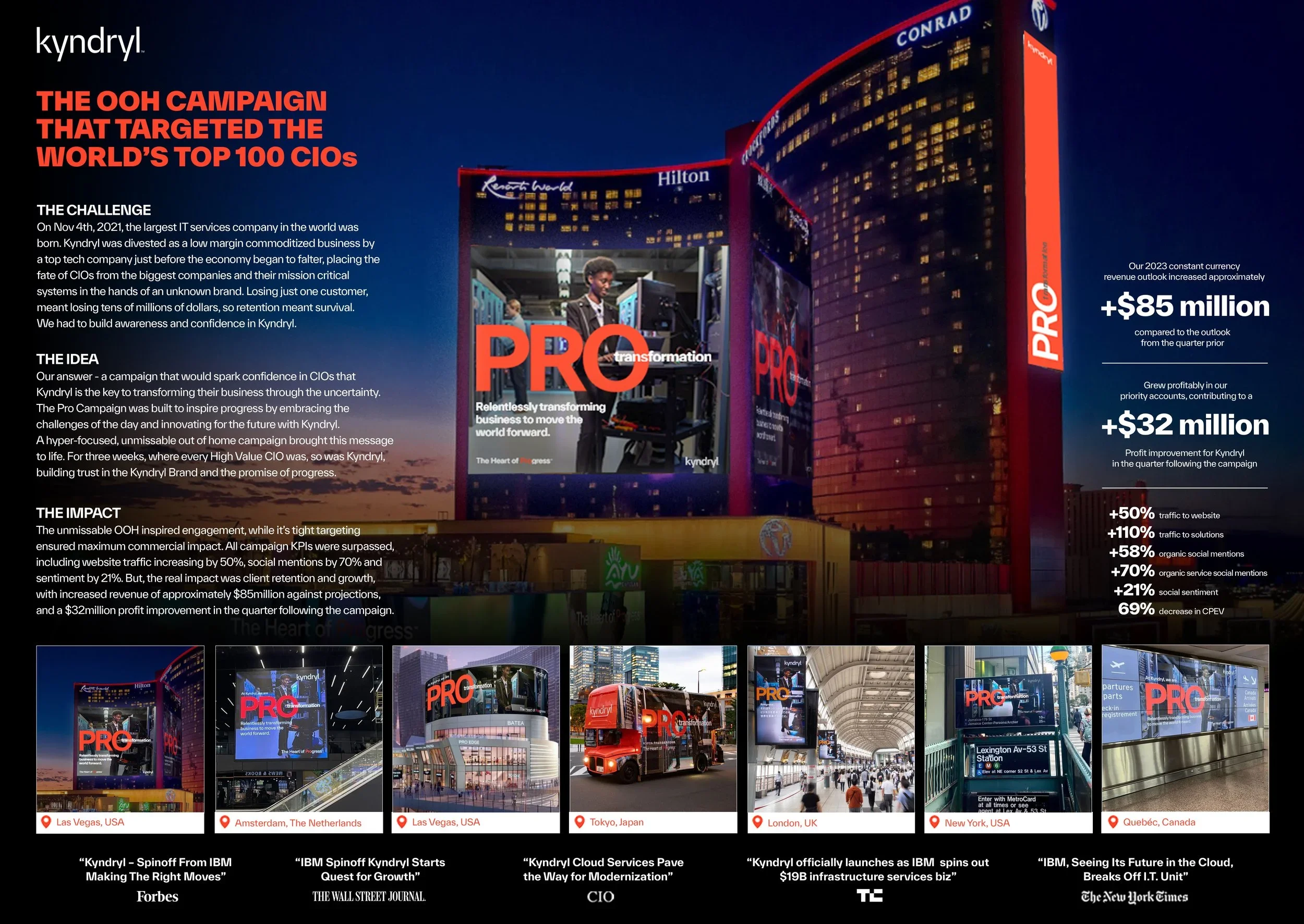 The PRO campaign was an opportunity to present the Kyndryl brand and the power of progress to employees, customers, prospects, partners and investors. This campaign aimed to engage and inspire audiences around the power of progress. It was all about bold ideas and bold executions.